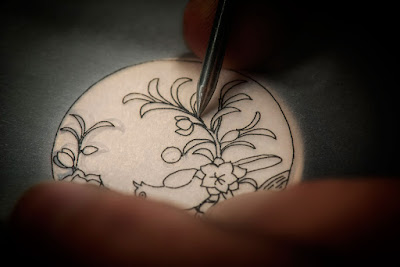 Jedes Zifferblatt ist handgefertigt und dauert ca. 100 Stunden, beginnend mit der Wiedergabe der Schlüsselelemente des Zifferblatts auf einer Goldplatte über Handgravur. Der Entwurf wird dann ausgeschnitten und graviert, bilden die Felsen, Bäume und Blumen.